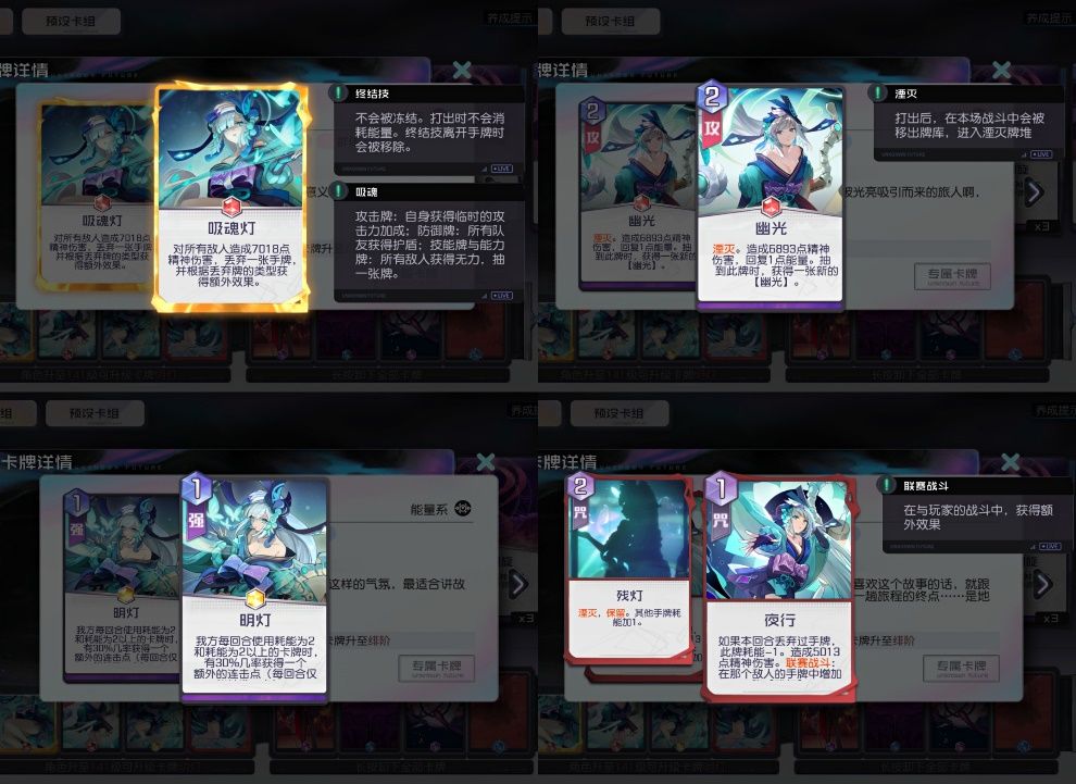 大家也能从卡牌效果看出来,青行灯的最大特点就是回复自身能量以及在PVP中给对手提高卡牌消耗能量,终结技也能够通过刷丢弃卡牌来刷buff,提高自身输出或者给予敌方debuff,而在这一次活动里又是需要大家去进行实时PVP的,所以拥有她可以说是一个很不错的队伍副c了,青行灯最强力的专属卡应该是属于明灯,可以触发获得额外连击点,攒取大招而且等级越高限制越少,是一个可以出奇制胜的卡牌。
