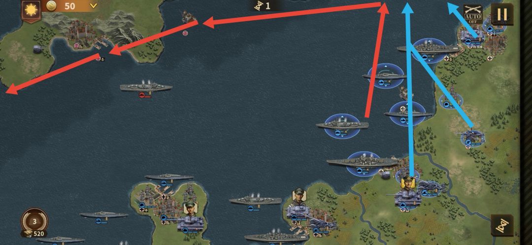 红线为海军行军路线,辅助友方海军行动。