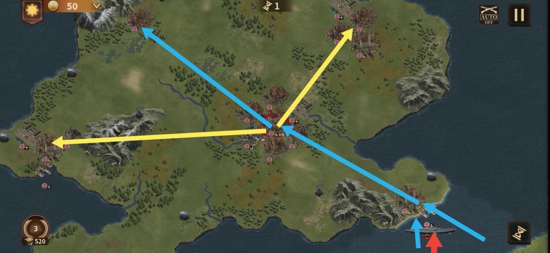 步兵部队全员转换为伞兵先行一步空降至爱尔兰岛右下城市,辅助坦炮部队登陆。