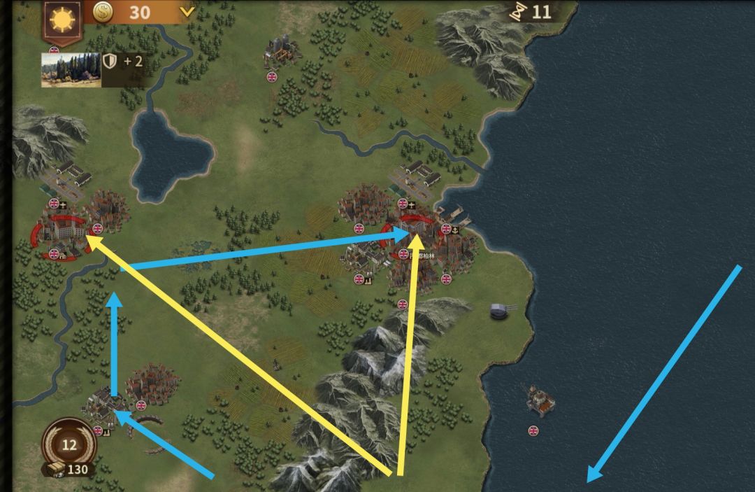 蓝线坦炮主力攻克利物浦后,在确保登陆爱尔兰岛不会损失过大的前提下进行跨海行军,登陆后沿蓝线扫平三红圈。