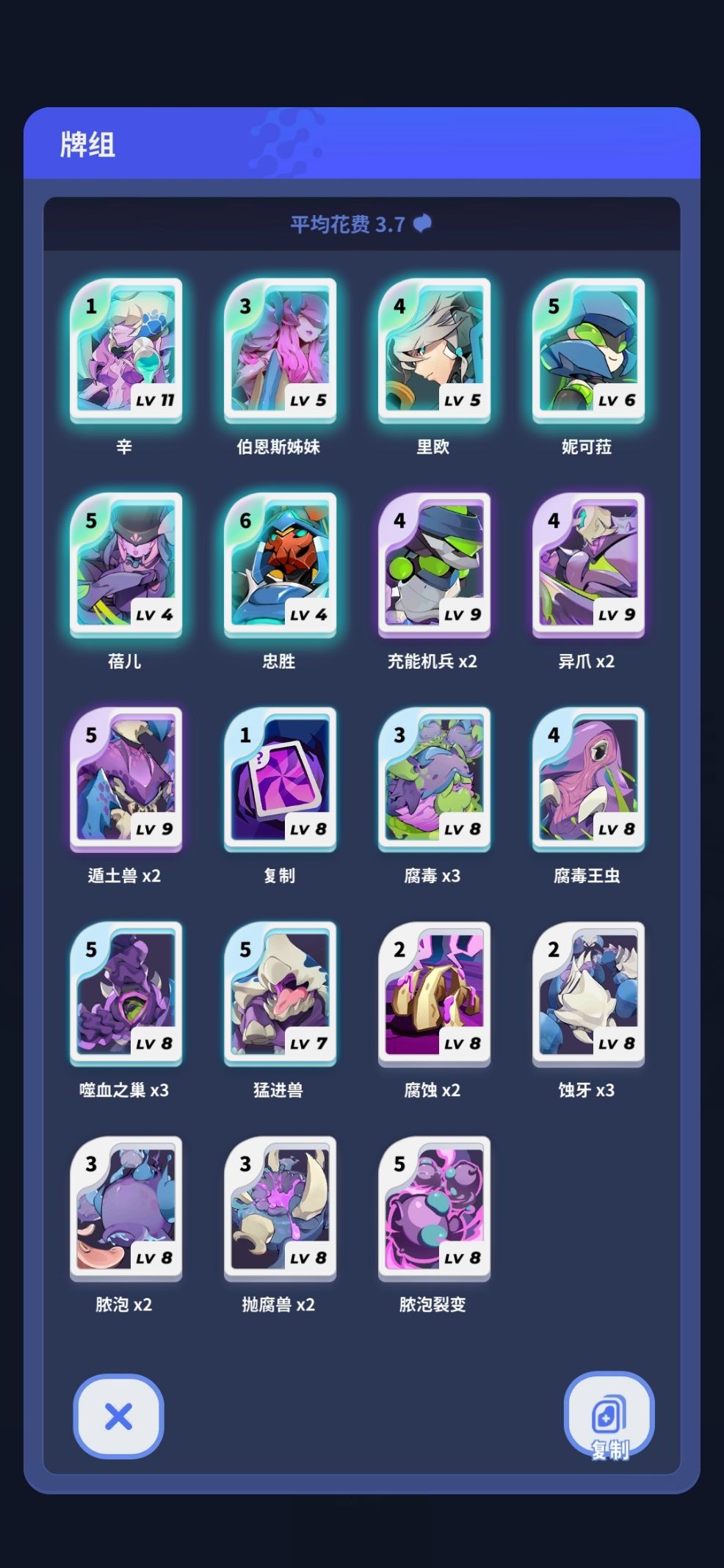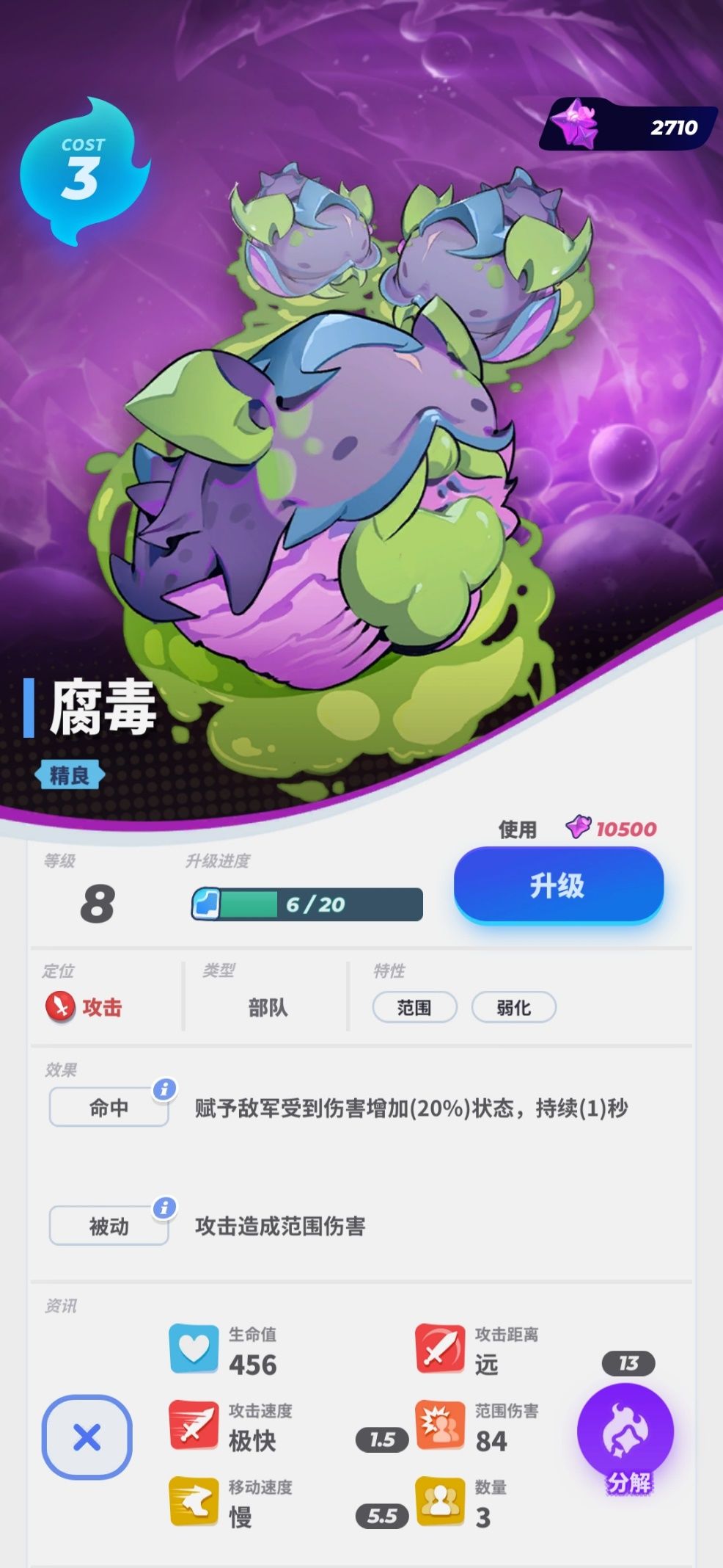 【腐毒】是异种处理多个敌方单位时最主要的战力,在攻击多个敌方单位的同时,还会使敌人受到的伤害增加,在遭遇大型敌方单位的同时,配合【异爪】【蚀牙】等卡牌可快速将敌人消灭。