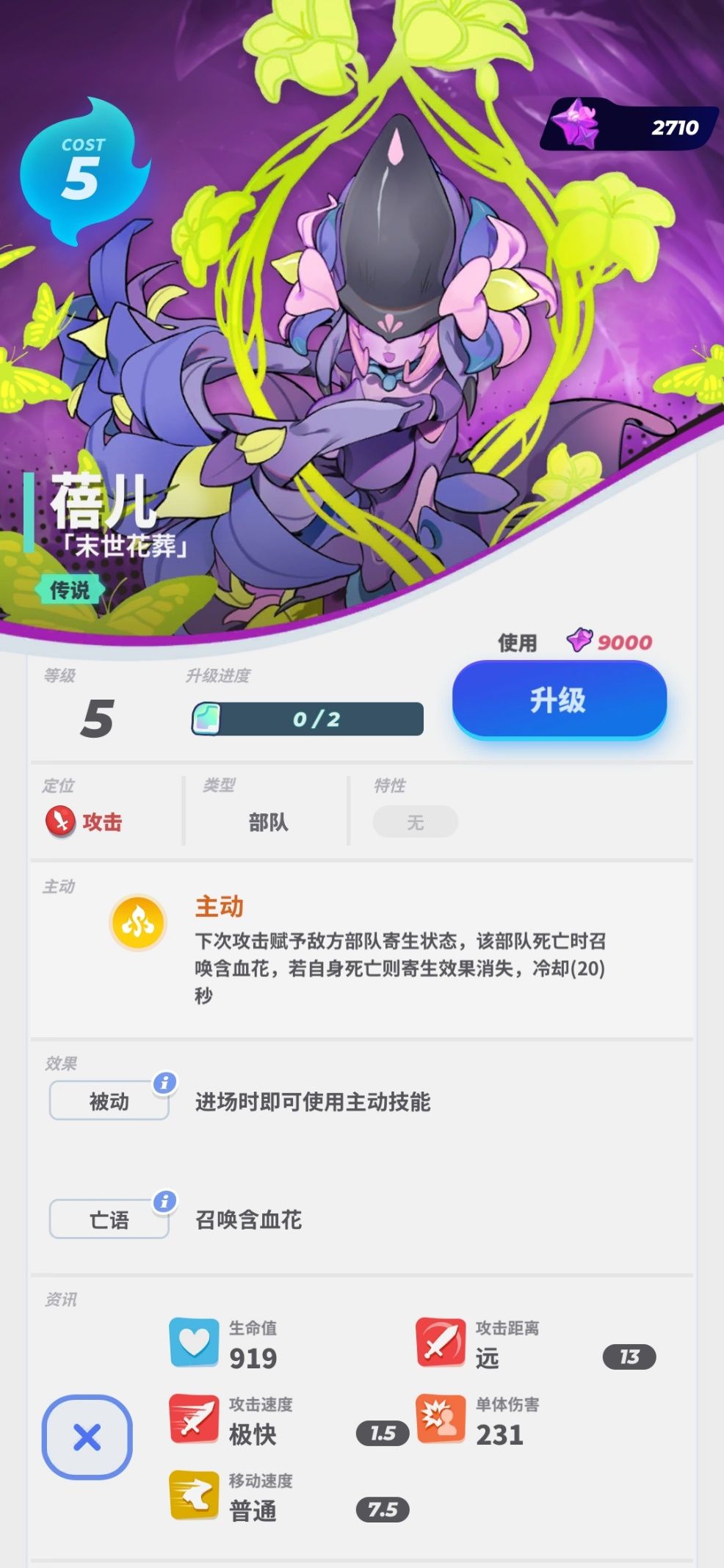 而新传说卡【末世花葬】蓓儿,则可作为后排输出单位攻击敌方单位;通过触发主动技能,击杀敌方单位来召唤【含血花】,若其被敌方单位击杀,则会在死亡的位置召唤出一株【含血花】,如果敌方守护者恰好位于【含血花】的攻击范围内,【含血花】会对其造成较高的伤害。
