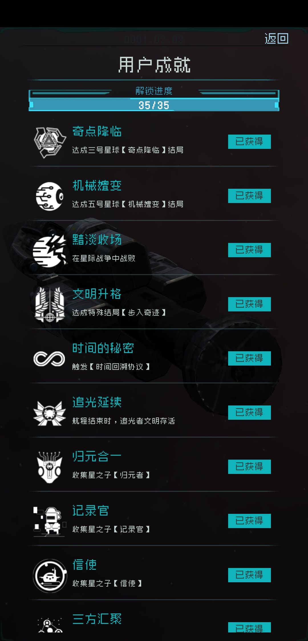 共生第二星,到第八星不攻击追光者文明,哪怕他先打你(如果不打你更好)。等第八个标签出来他会撤回攻击,最后宇宙中心选择对冲或逃离即可,新的周目查看成就就有了。