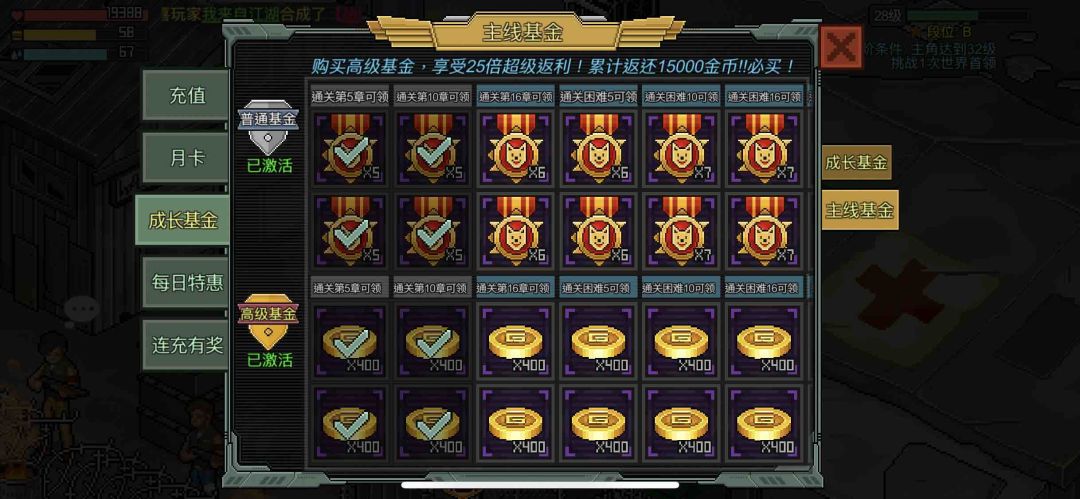3.主线基金,对,你没看错,主线任务通关到一定关卡,也可以领取同成长基金相同的奖励,不同的是主线基金给的免费奖励好像是升级宠物的东西,氪金奖励也是钻石!