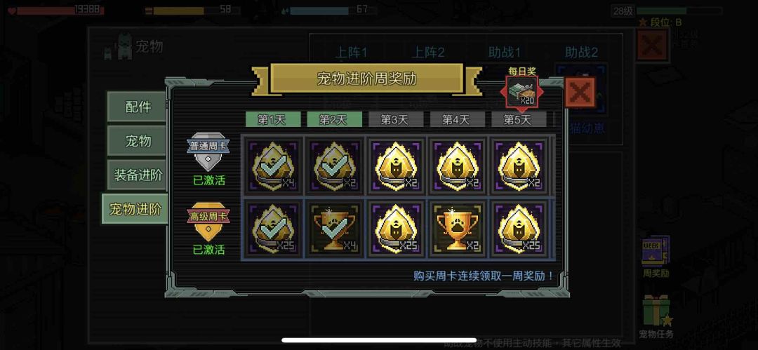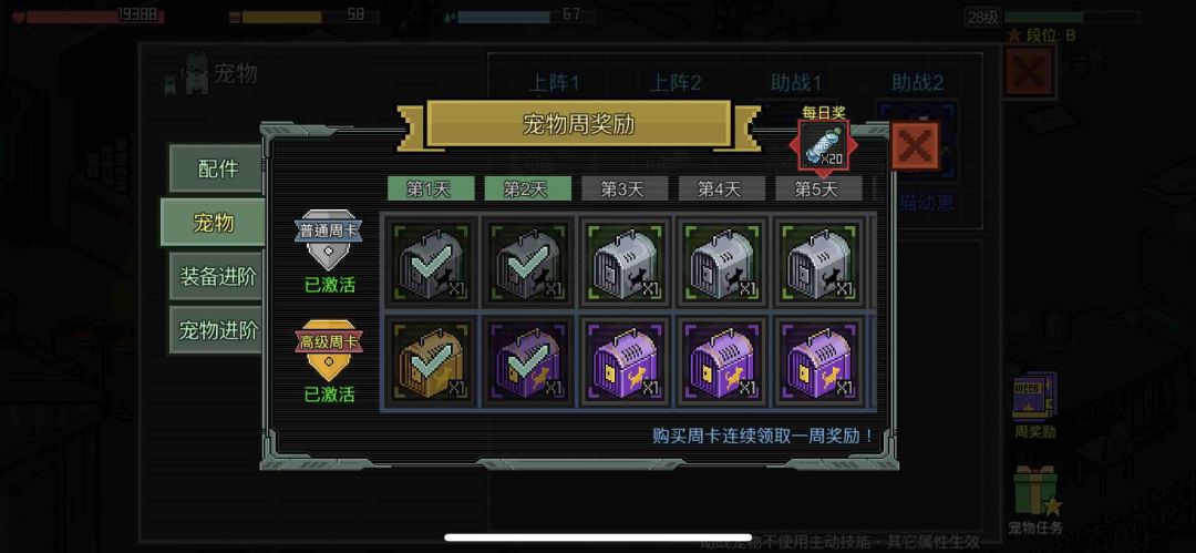 5.接着说游戏内隐藏的比较深的一个坑,我称为四大周卡!分别是配件、宠物、配件进阶、宠物进阶四卡,这四卡的收费方式就很奇葩了,它不要你现钱,它要你转手一到,要钻石购买,奇葩吧?价格我记不太清了,好像分别是333钻、666钻、444钻、888钻(有知道小伙伴帮我纠正一下)也就是33软、66软、44软、88软,兑换比例是1:10