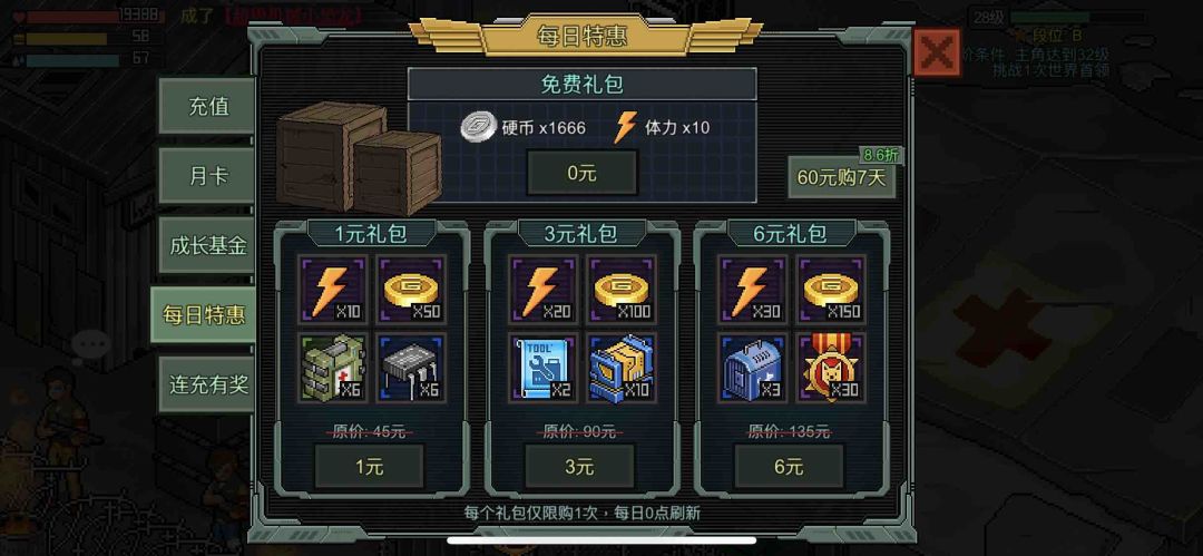 4.每日特惠,极低的价格,让你感觉天大的优惠,呸(吐口水),这个每日特惠就是一个10块钱的体力礼包,最骚的是还有一个折中折,60块钱包七天(捂额头笑了)!你是不是觉得天大优惠了?