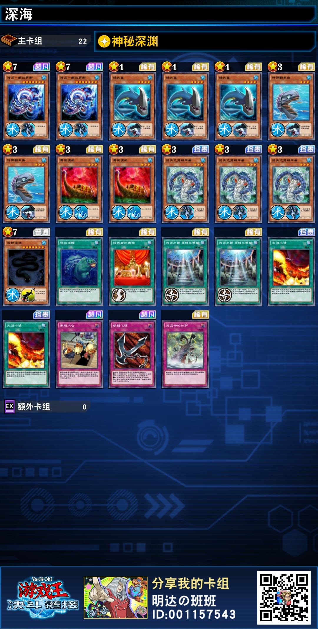 我将一张海龙换成了寂静深渊(黑蛇),一方面是因为黑蛇跟海龙有差不多的清怪效果,但比海龙站场更有威慑力,它的效果说简单点就是被战斗破坏的话,破坏场上除了水属性之外的所有怪兽,一旦对面场上有较多高攻的怪兽,黑蛇的站场会为你拖延一些时间,其次是因为之前和某个牌客私下约战的时候,海龙召唤发动效果被天罚解掉了,这也让我思考了海龙虽然拥有霸道的高收益,但是风险也高,所以在牌库思索再三选择了不太起眼的黑蛇,可能后续还会有调整,但目前黑蛇的加入还是顺利让我到达了传奇1段。