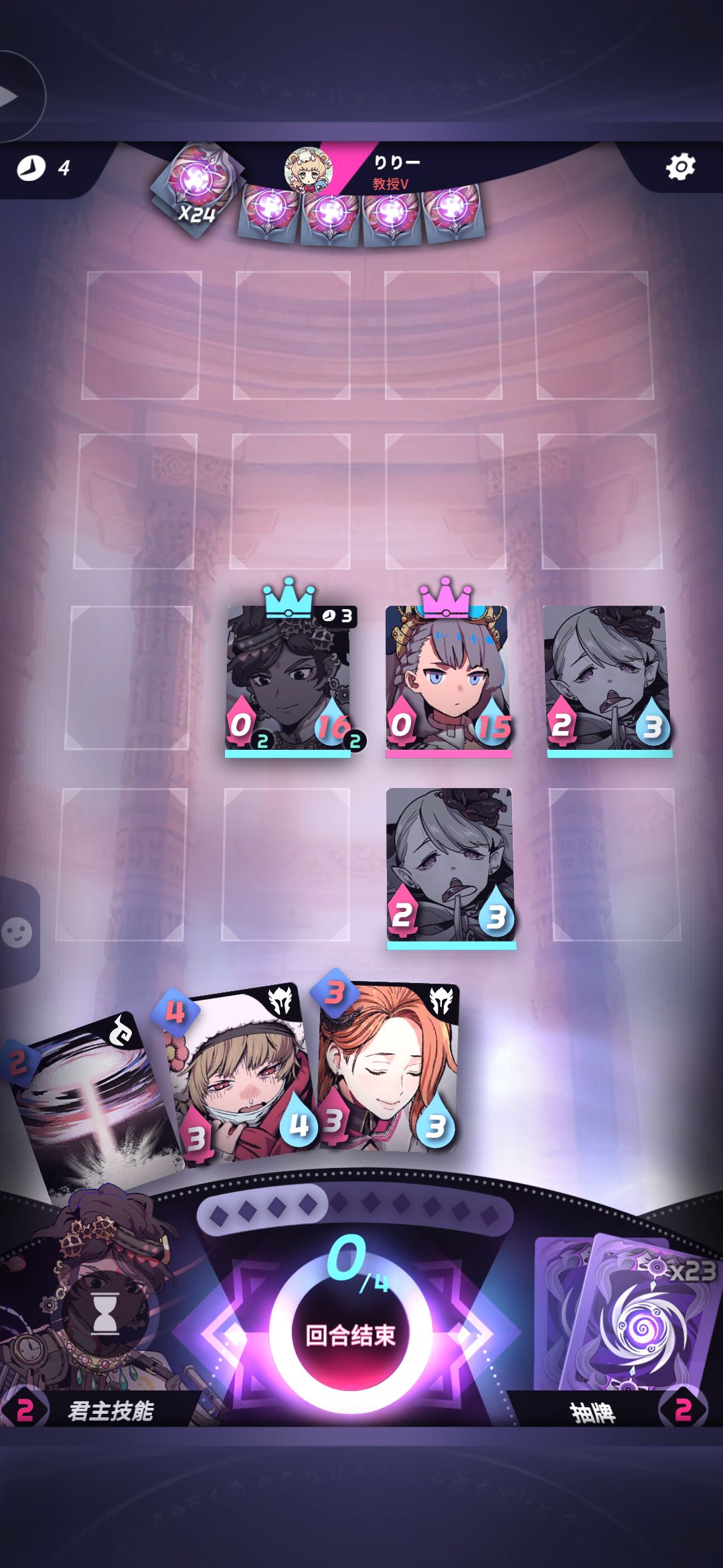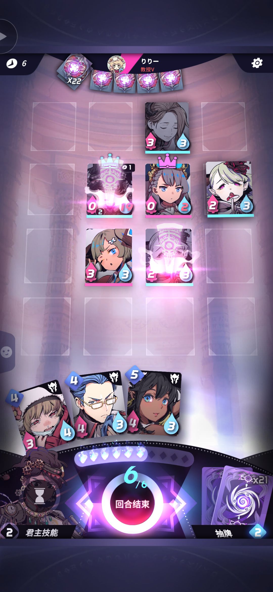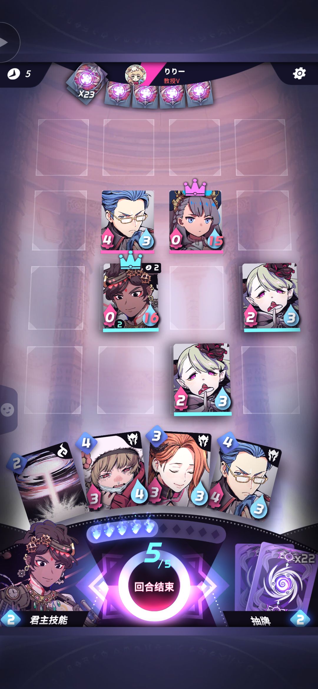 对手胆子挺肥,竟然不进角落,那么我方君主移动至23,放置43一个二费角色进行夹击。众所周知角落只有2个面受敌,边上3面,而中间4面,所以我们要尽量让对手不进角落,保持在中间,让我们输出最大化。
