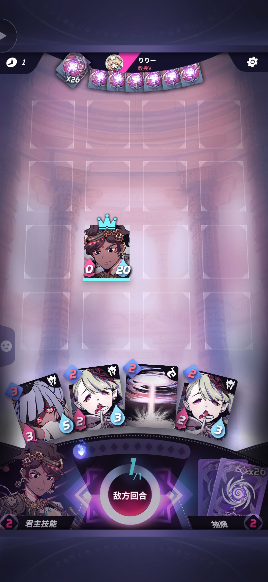 天神分主场客场,其实也就是先后手区别。后手多一张回复1火的牌。开局找牌见4费5费直接换成2费3费牌。后手站位贴着对面君主,先手则选择22(从左到右2,从下到上2,后续也是这样描述位置)的位置。