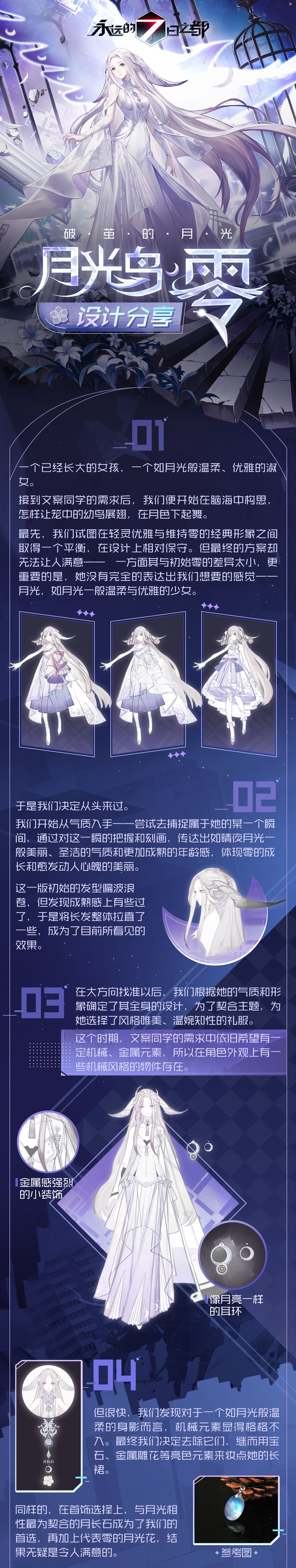 在美术小鸽和文案小鸽的共同努力,月光鸟·零 的外观设计完成啦~美术小鸽将为大家介绍人物的创作灵感和过程,还有月光鸟·零外观设计的思路。指挥使们和7都督一起看看吧!