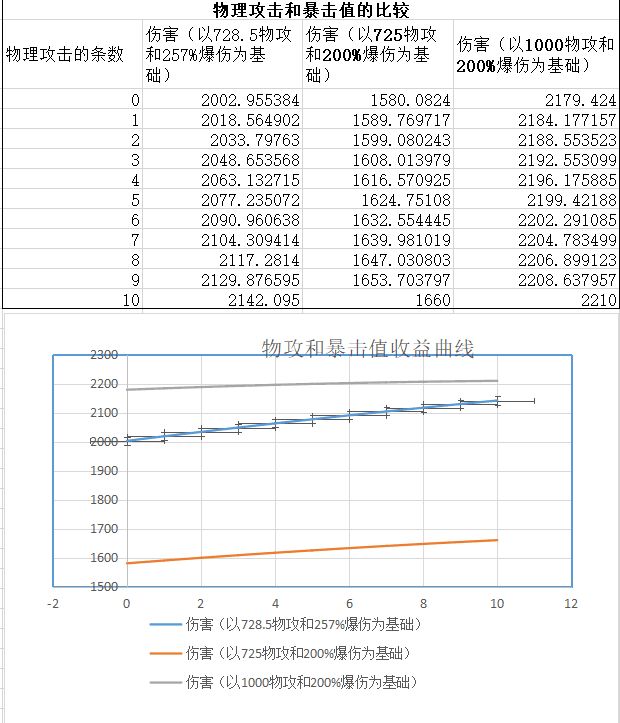 0-10为打物理攻击的条数,一条物理攻击按10.5的平均值算,一条暴击伤害按4.25%来算。平民玩家(500攻击,200%暴击),打物理攻击和暴击伤害,其实收益是一样的,但是越强的话,暴击伤害收益越高!
