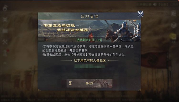 答:在活动期间,有回归角色的玩家进入游戏后会自动弹出回归活动界面 在点击备战区按钮后,点击【开始游戏】将可以选择角色转入备战区。