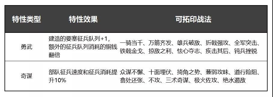 以世族特性“勇武”和“奇谋”为例,特性效果与可拓印战法如下表所示: