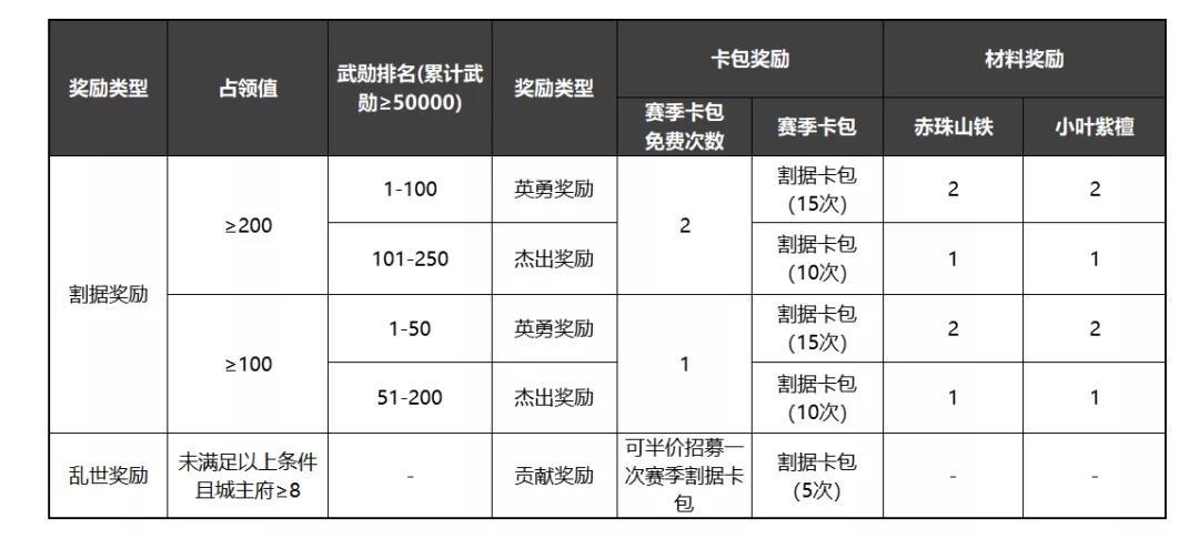 本赛季中,各个世族结成同盟竞逐天下。赛季结算时将根据各个同盟的占领值来进行最终奖励的结算。同盟之间排名决定征服、割据及乱世的奖励名次,同盟内部的各个世族同样以世族所获得的占领值进行排名,决定细分的奖励档次。