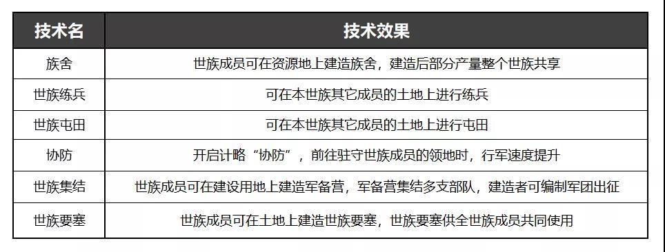 名德相望,冠冕相承,世家大族往往拥有体系化的技术,这些技术能让世族成员共享土地和建筑,主公可在资源地上建造族舍,建造后该资源地的部分产量供整个世族共享。族舍产量将是本赛季资源获取的主要途径,为世族成员带来大幅的产量提升,因此也将移除占领城池的资源产量加成,转而提供税收加成。此外,主公还可筑造世族要塞,与其他世族成员合作使用,共同应对战场变化;亦可兴建固若金汤的军备营,集结世族部队,摧城拔寨。