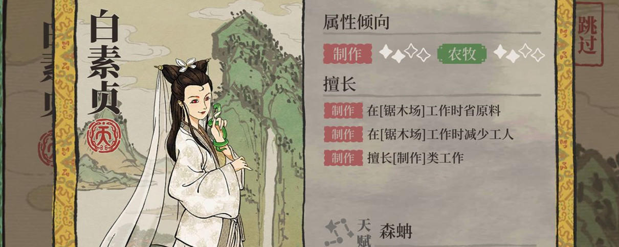 白素贞在【锯木厂】工作时,可以省下原木材料60%,且工人需求-1。