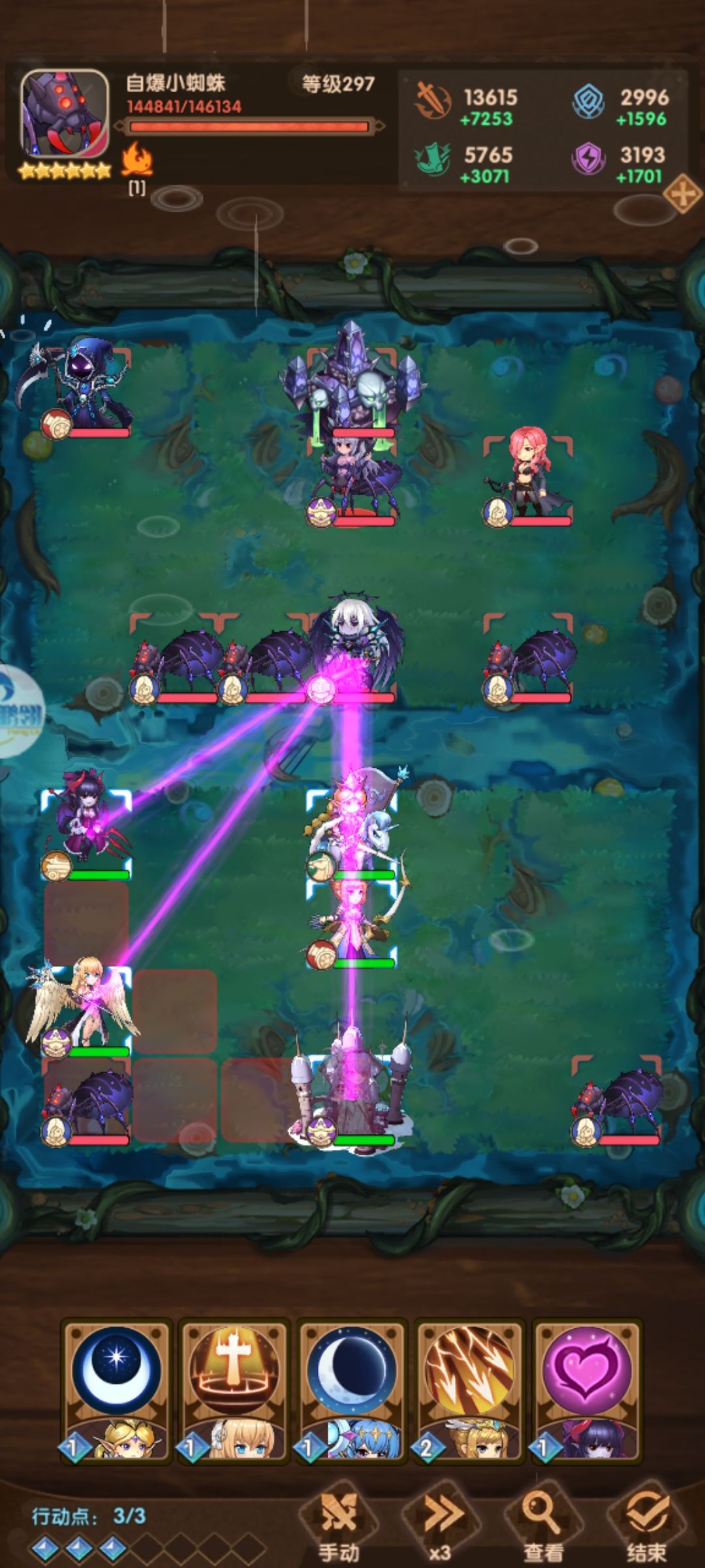 首先说皇子为什么时间不够,这个蜘蛛女王会一直招两个蜘蛛去你家,导致皇子如果离开家,下回合就得回家 如果不离开家又打不到蜘蛛女王。但除了皇子,只有你家攻击力最低的有可能守住(银月开局会给攻击最低的隐身,所以也能躲链子,被链的没资格守家,月影的概率是有限的),而这个守住的概率也完全是看月影(下面是自爆蜘蛛属性),我是觉得不行