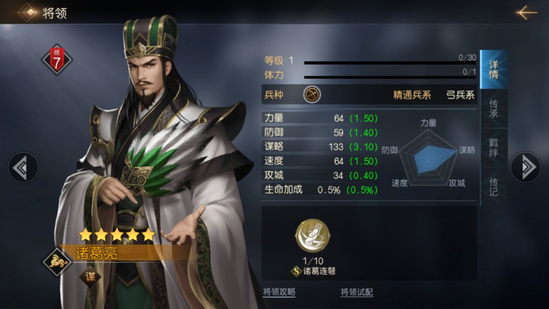 诸葛亮是游戏中非常强悍的输出型将领,技能伤害高,次数多,依靠跳过准备回合可以瞬间打出爆发伤害,快速清场,是非常核心的谋略型五星级将领。