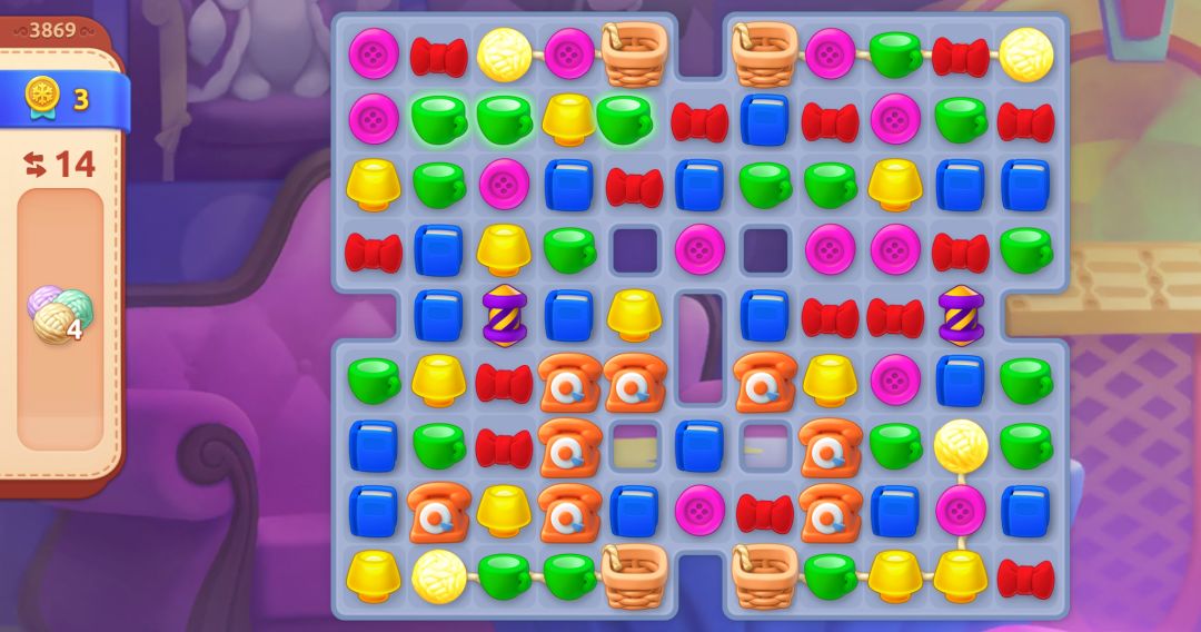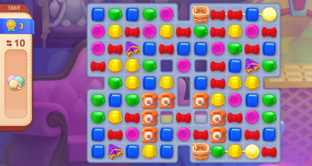 刚开局的时候要注意观察元素的分布位置 ,电话机主要位于中间位置,毛线球在左右各一个,中间有2个毛线球。我们可以根据左右元素的分布位置以及电话机响起的位置,来判断从哪一边开始入手消除,原则就是能组合道具,能尽快消除电话机扩大消除范围,激活毛线球。