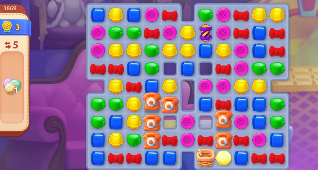 消除的过程中,这一关很容易犯的一个错误就是被电话机迷惑 ,容易执着于将电话机全部消灭而忘记了毛线卷。道具的效果可以穿透电话机,火箭可以远程触发毛线球,前期消除的时候,只要把最外围的几个电话消除,触发毛线球就可以,剩下的电话机只需要在收起毛线球的过程中,消除毛线球路线上会堵住路的即可。
