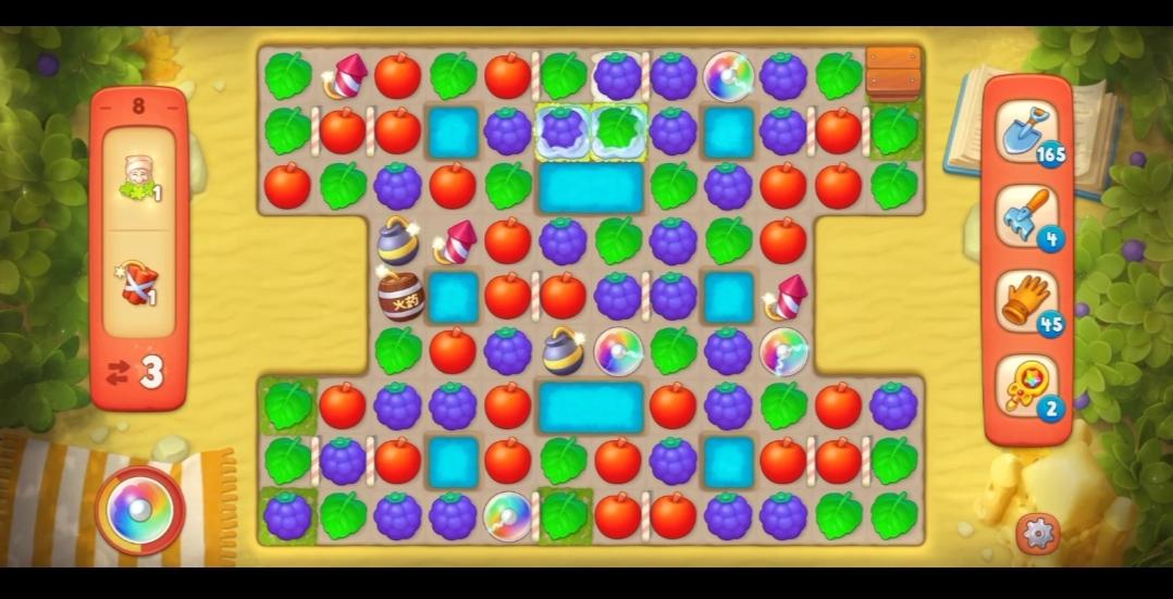 开局后,每一步的走向都要以获取瓶盖为中心,只有得到瓶盖才能继续后续的消除工作,所以,前半段一定要以获取部分瓶盖为基础。根据以往的过关经验,再加上本关开局只有7步,完全可以断定此关很容易合成道具,这就是本关隐藏的一个buff,但是有些关卡是需要用元素去触碰才能触发隐藏的buff。比如此关,如果没有一次的爆破,造成一定范围的消除,是很难触发隐藏的buff,所以,只要找到前提条件就很容易触发隐藏的buff,利用好这个优势,接着就会接连不断的产生各类加速道具。