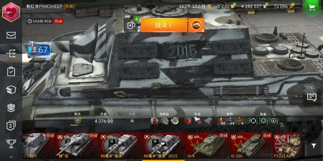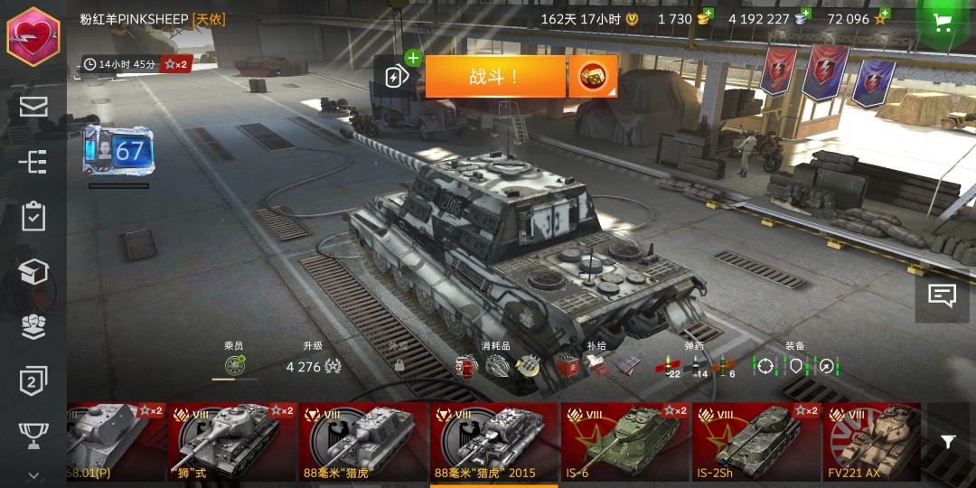 就在前年,我的车库里金币车只有一辆狮子,然后很日常的刷钱,突然看到对面出现了一辆叫88猎虎“暴风雪”的车,立马就惊讶了,在城里遇到他的时候,被这个名号吓的不敢出去生怕是个老手在钓鱼。