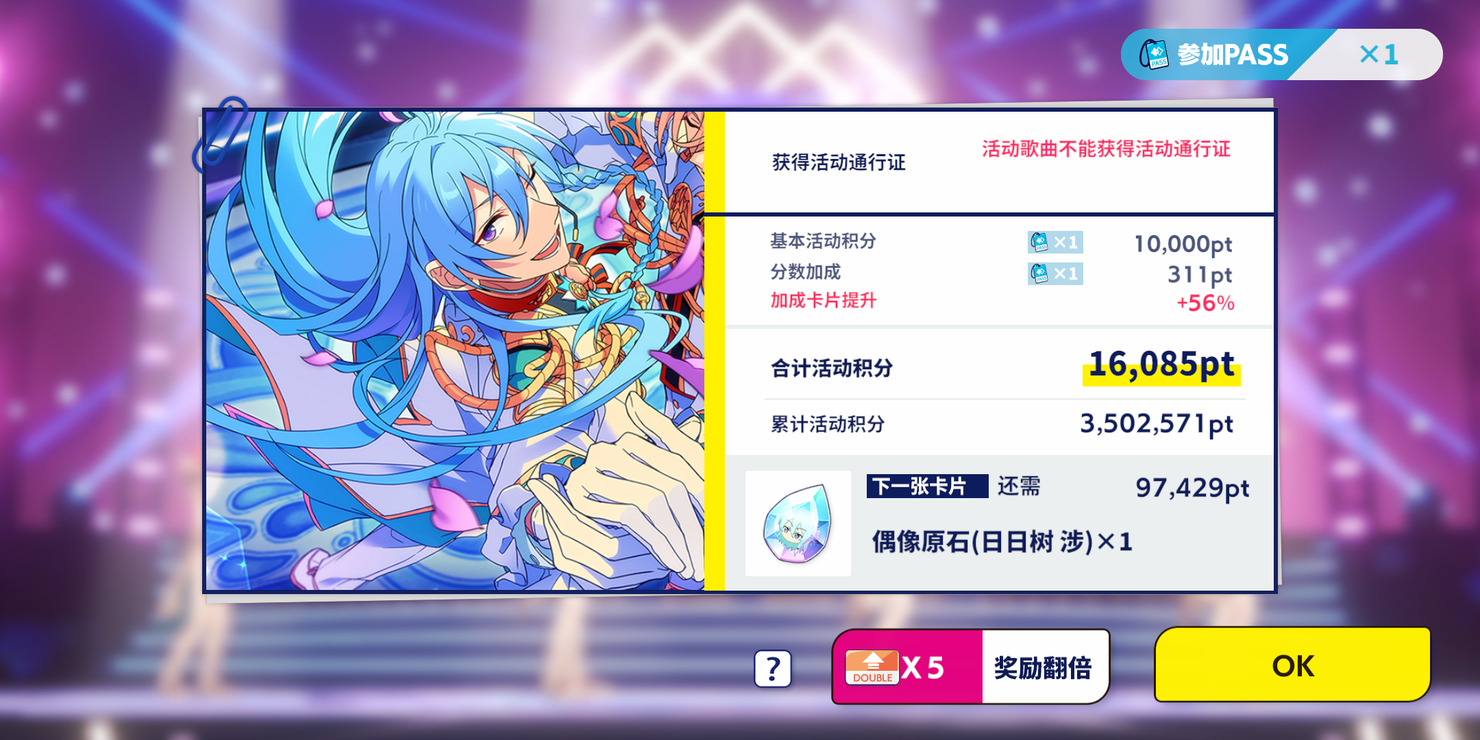 碎了大概4000多的钻吧,因为18,19号没怎么上线,都是清理了BP就下线了,所以碎的比较多,然后卡池抽了20抽,有13张券,大概花了1140钻,总共加起来有5000多钻,有两张大将和几张三星卡,56%的加成,拿了一卡,我觉得这一次活动不亏,就是奖励里面都没有哨子,扩音器也只有一两个,希望下一次活动可以多给一些哨子和扩音器吧,毕竟我已经为了涉涉倾家荡产了,泉的卡池也不约了(三个月以后都可以拿到的),现在先攒钻约下一次的活动卡池吧!加油鸭制作人!