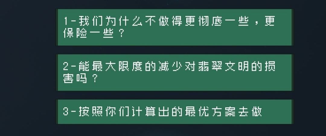 第三星:纷争再起,对话框选择干预和做的更彻底,最后共生。 奇点降临,对话框选择不干预和尽量减少损害,最后共生。 翡翠崩灭,收割。
