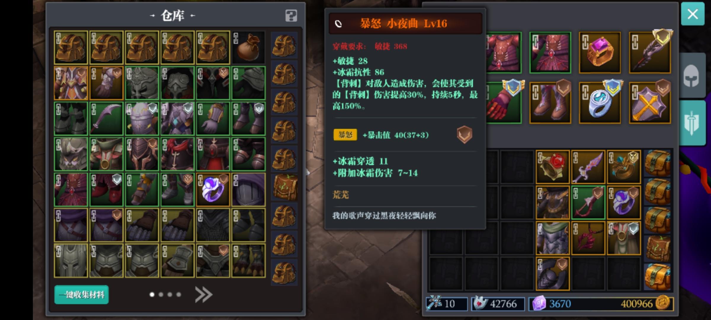 小夜曲,疾风迅雷,凶兆,背刺两件完美词缀,芬里尔将就,屠夫也行,羽毛套刚刚做出来,极速值的手,终结皮甲两件套,无限反击,宫殇+玄武腰带,华戒只有个力260需求,敏没词我卖了。求各位大佬给个搭配,我刷狗粮去了