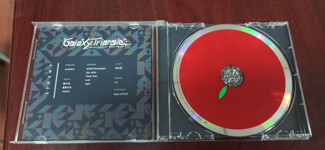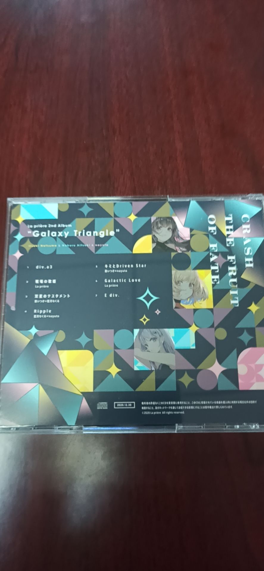 最后一点的长篇大论用来抒情。其实发这回帖子卖安利都算是次要的(我主要卖的安利肯定是爱丽丝夏赫啊,这个还轮不上),就是想聊一下这张碟子为什么让我心动,不惜要花个几百块钱也要从日本运过来专门听实体砖。在我相对比较迷茫的时期我开始听ad piano的钢琴曲,然后认识了蓝月,之后又了解了Endorfin,再到后面的La priere。从我一开始接触音游以来,基本上我是对有vocal的歌曲不太感冒的,后来在听Mili或者是之后的爱丽丝乐团的歌,我才开始欣赏这类音乐。然而也仅仅是单个声音让我心动,而在我听到La priere在第一张砖Gemini Syndrome的三人合唱的时候(那个时候已经听了一个多月的蓝月的歌了),我发现原来这三个人的声音组合在一起,更加令人感动。在2020年底的时候,Galaxy Triangle出来了,五分钟的试听就已经给我另一种震撼的体验了,所以我决定咬咬牙,买下人生中第一张专辑。