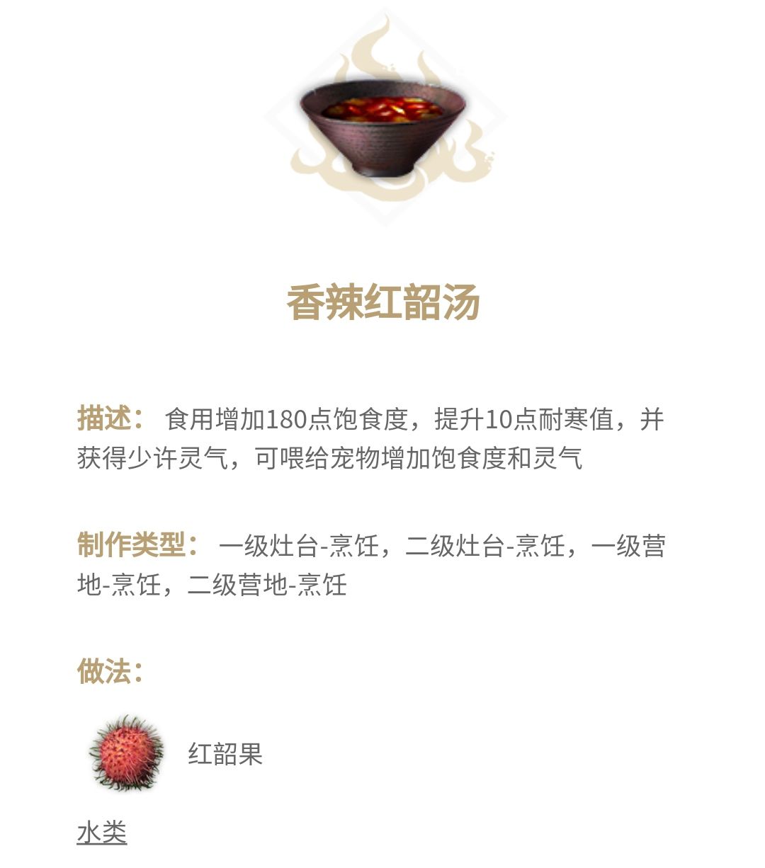 去雪山时可以喝上几碗,比热水耐寒值提升的多(不过热水更容易做,可以看情况选择)