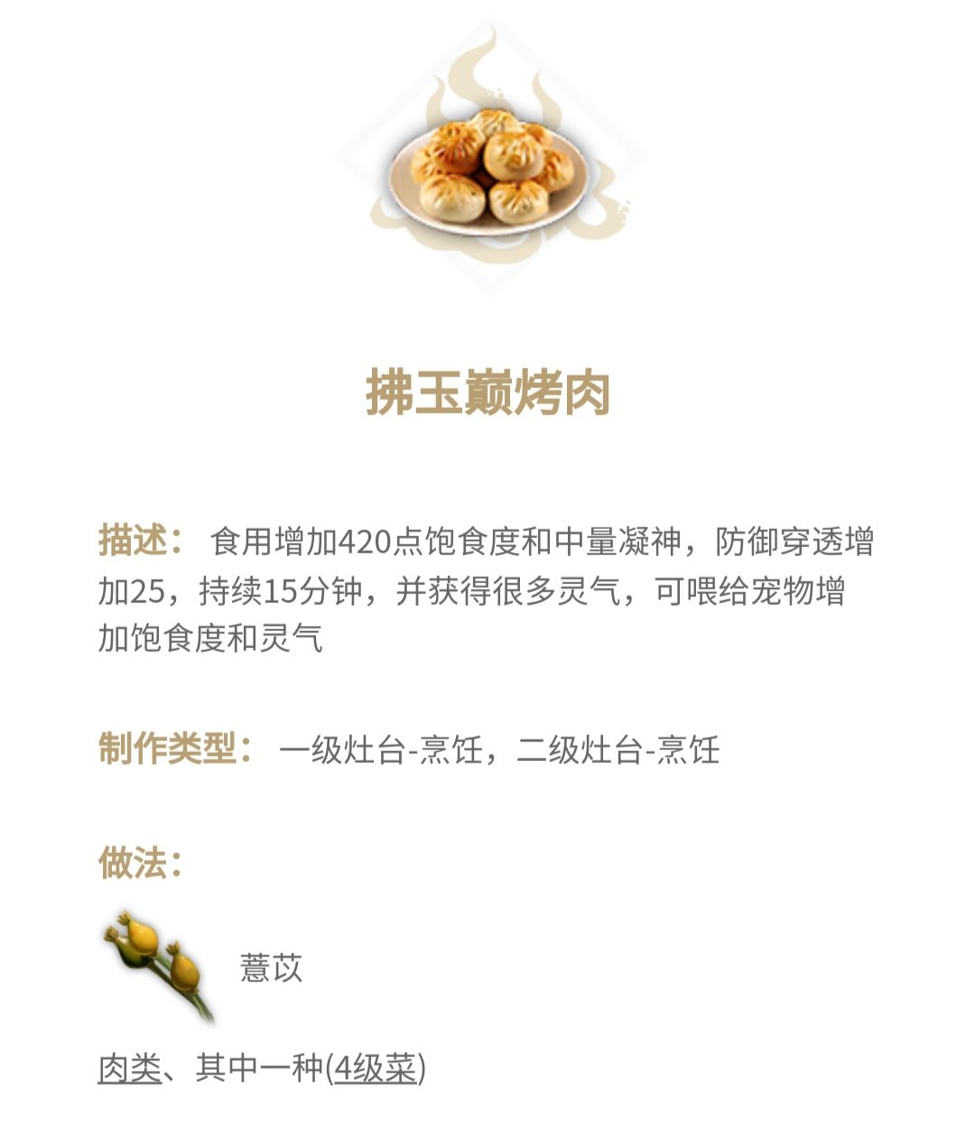 推荐理由同上,也是很容易做的凝神菜,只不过这个需要四级菜,要两个二级菜合成,难度比上一个高一点,但是它还加防御穿透,嗯……也算值了。