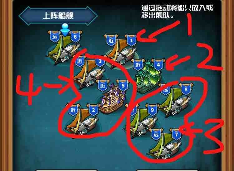(龟炮用于分摊炮伤;两艘郑和几乎是没有用的。弱肉2被击沉,敌方前排向强肉9聚拢,强肉9被击沉后,前排向辅助炮1移动,拖延时间并制造出开炮机会)