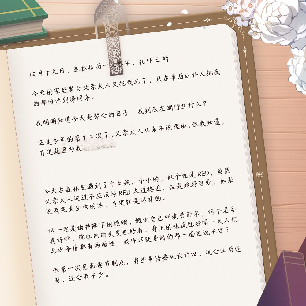 埃普丽尔的桌面上居然平摊着信纸和羽毛笔,真是稀奇的景色。奥利维亚小姐已经睡下了,但日记本似乎忘了合上,优秀的淑女会在日记上记录些什么呢?