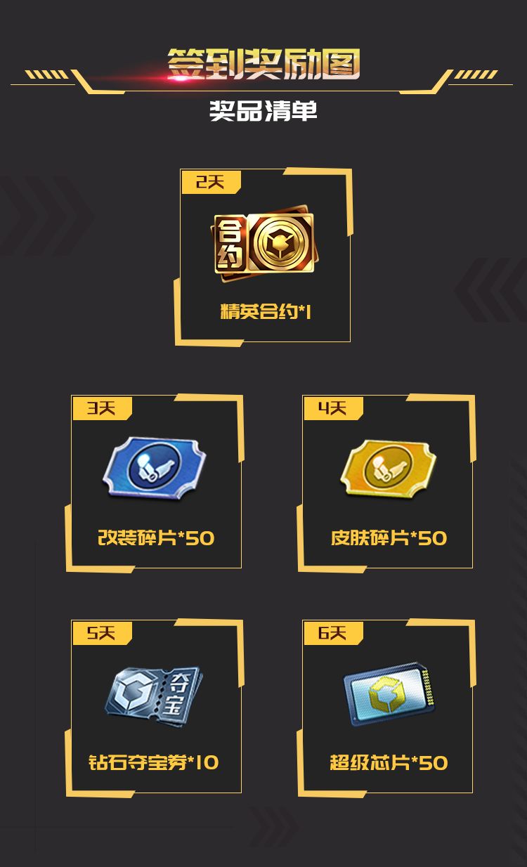 签到奖励向上兼容,如签到3天则获得改装碎片*50、精英合约*1