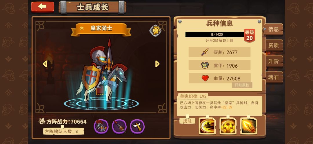 皇家肉盾的存在,放慢速度,增加防御,非常的能抗,并能使敌人缴械不能普通攻击,肉盾第一选择