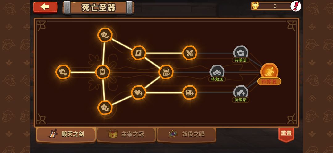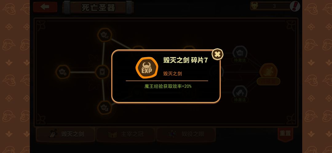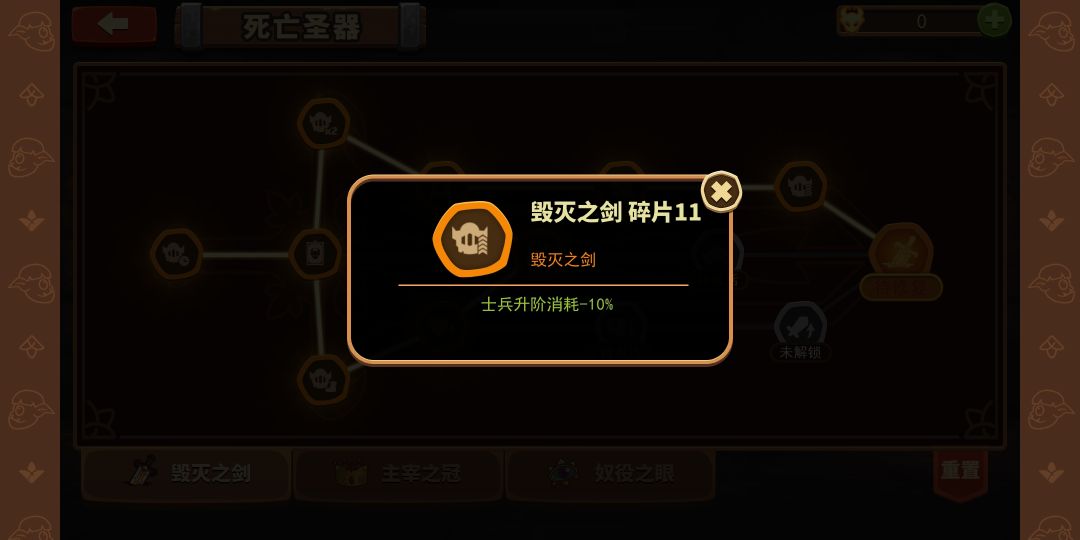 这四个必点,毁灭之剑碎片5士兵获取经验+20%,毁灭之剑碎片1魔王获取经验+20%,毁灭之剑碎片11士兵升阶消耗—10%,毁灭之剑碎片8装备强化消耗—10%,可以减少很多资源浪费,使你士兵人物升级升阶更快,因为要练的英雄多,所以越早点越享受,长远价值极高。