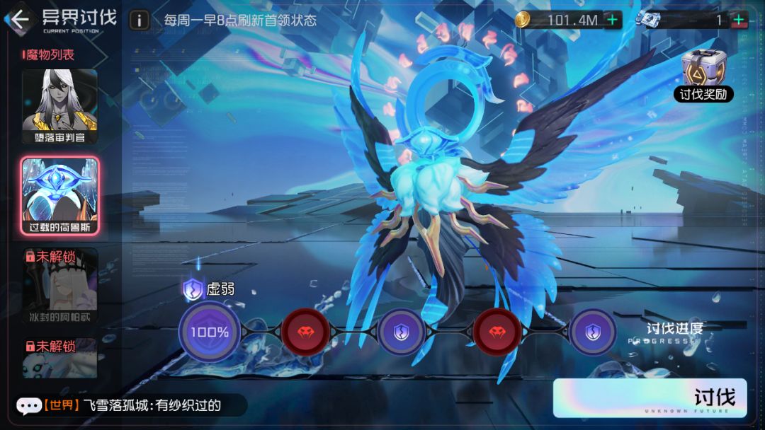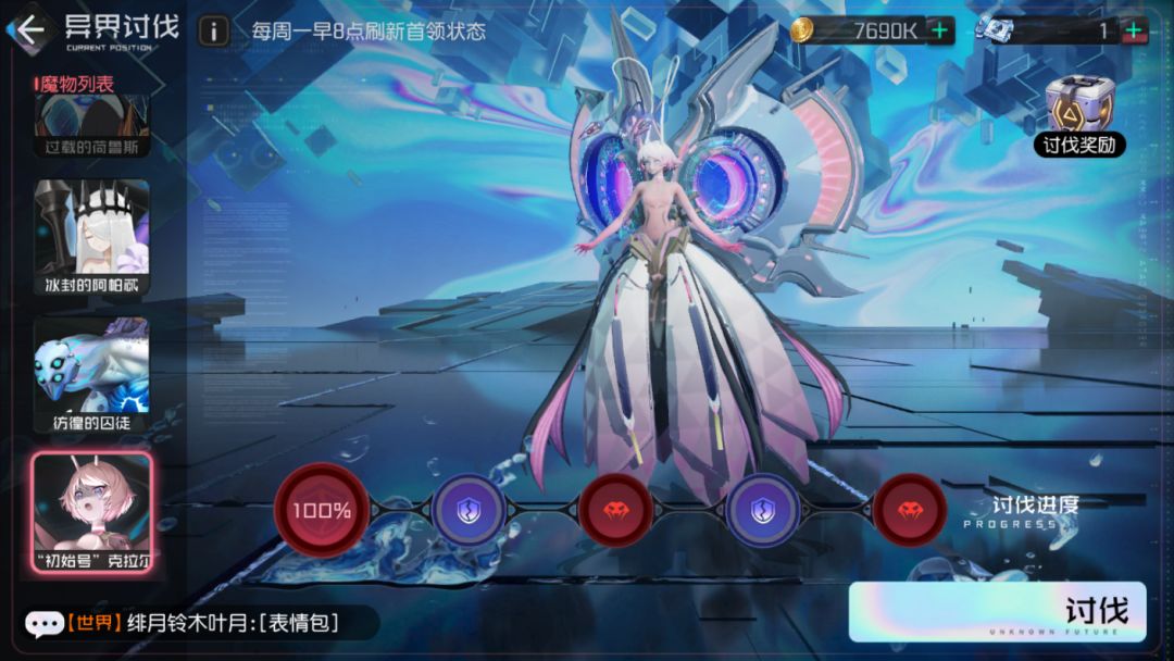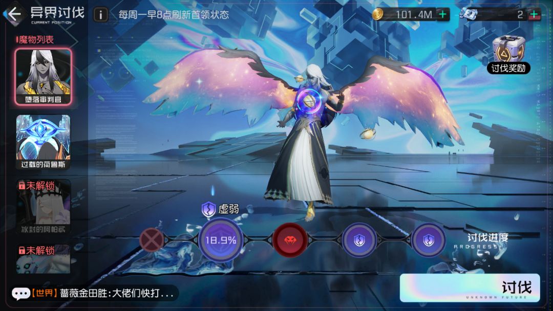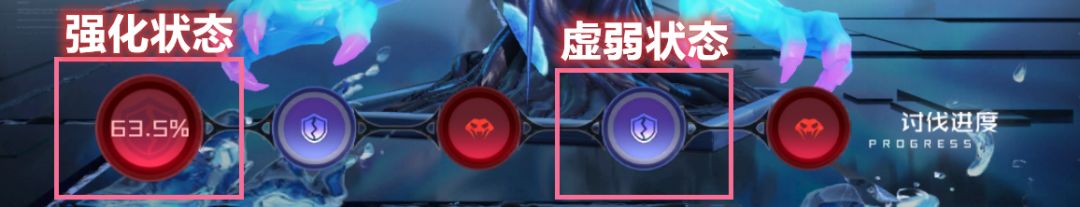 讨伐BOSS的入口可以看到BOSS目前所处的阶段和状态,虚弱状态内可以造成的伤害更高而强化状态里需要注意自身的血量哦!
