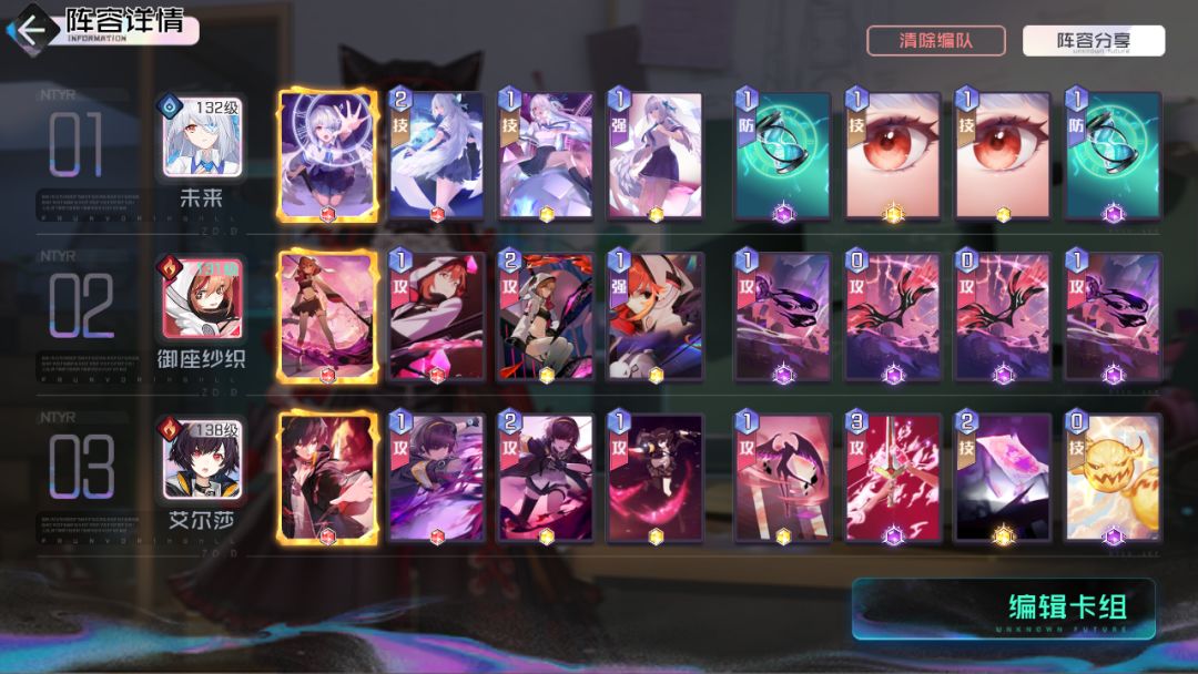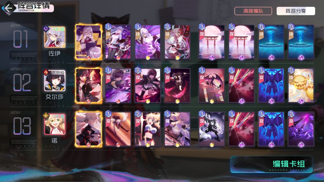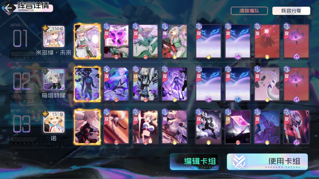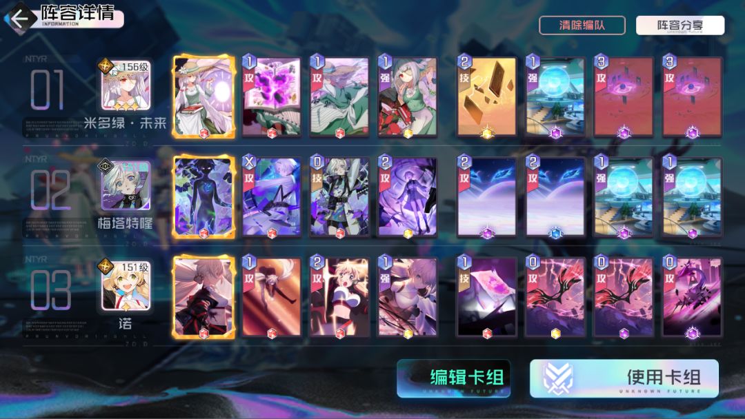 异界讨伐是以最终伤害判定排行的,所以没有必要带守护、支援了,我们所要考虑的就是5回合打出最大伤害。满暴击的诺可以打出比艾尔莎更高的伤害上限且可以带【重现】,梅塔特隆主要就是清手牌,绿来主输出。