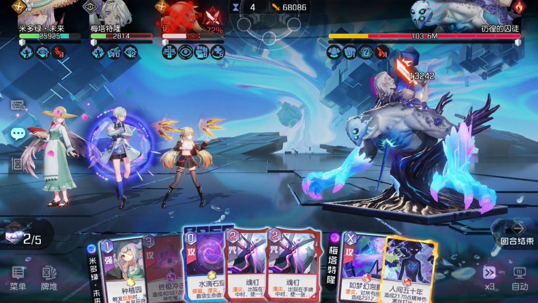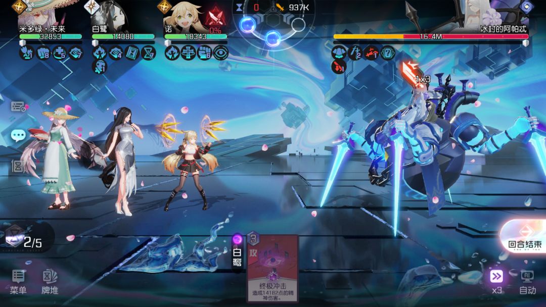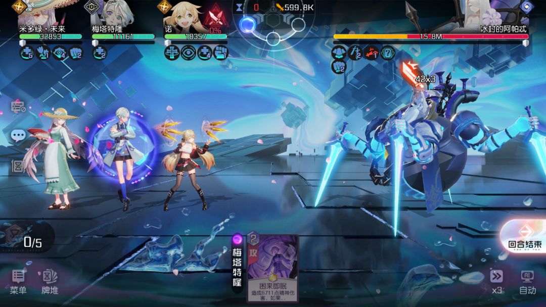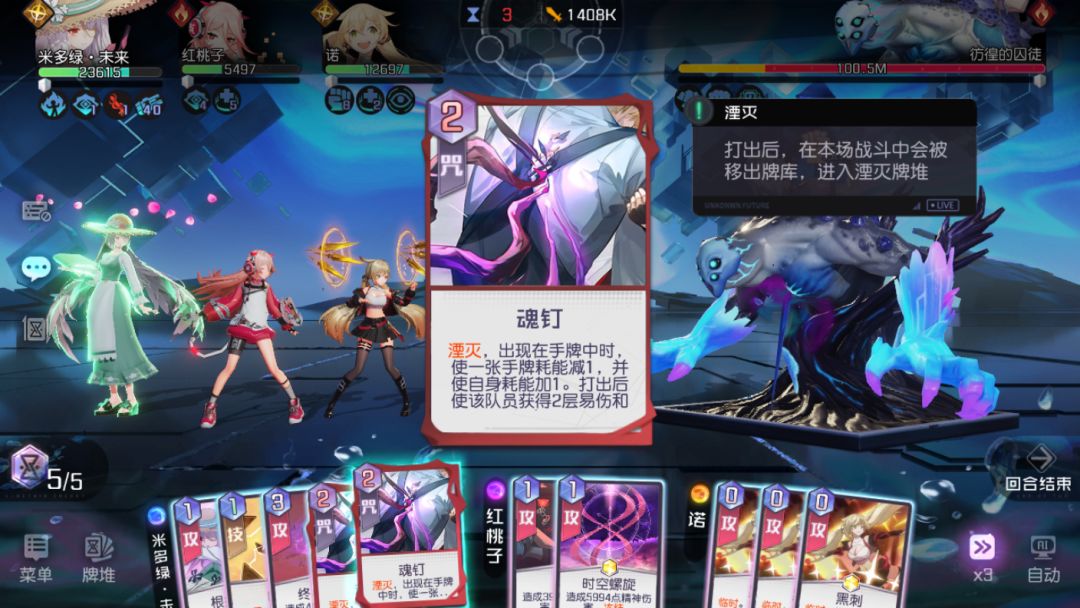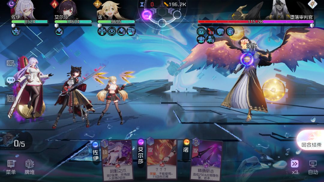 攻略君找了个等级最低的素材号,仅供参考。一共5回合,BOSS基本打不动所以只需把注意力放在输出上即可。佐伊配了湮灭和冷却牌保证抽牌库中大概率全是攻击牌。输出角色谁高用谁。
