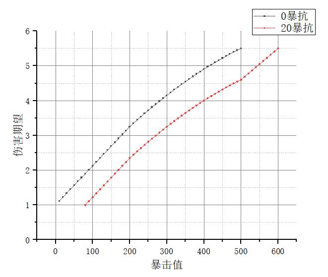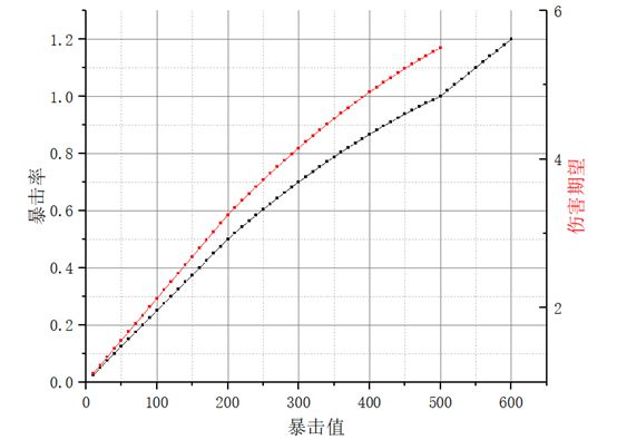根据暴击值的公式和对伤害期望可以做出这个图,(爆伤假设为400),可以看出伤害期望由于爆伤很高,曲线的线性度很强,所以高暴击率的收益也不会低,而根据暴击公式,暴击在超过500的公式为暴击率=暴击值/5,发现在超过500暴击的情况下,暴击率和暴击值呈线性关系,从图中可明显看到暴击率的斜率相对于400-500大了不少。