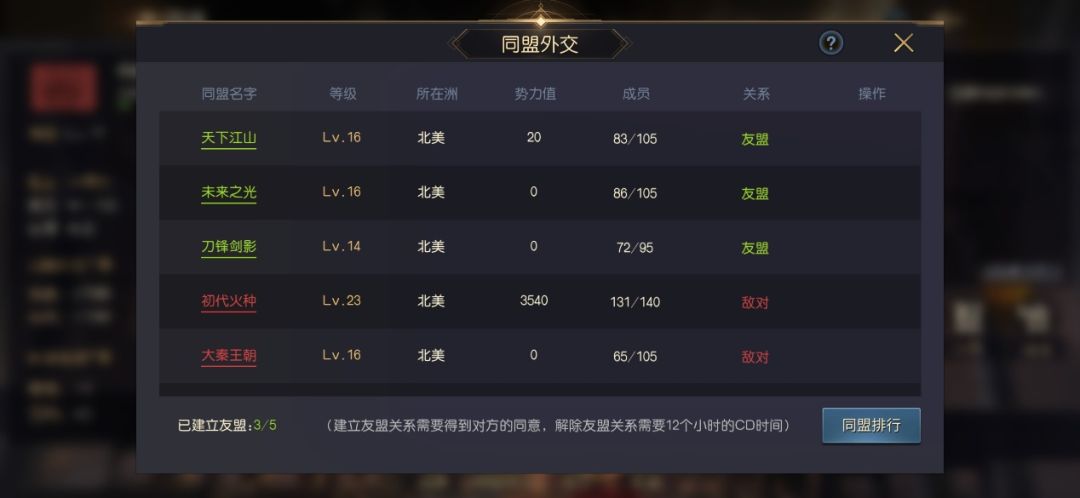 在游戏中,小伙伴们还可以与其他同盟结为友盟。友盟是双向的状态,需要得到对方同盟的同意,才能设立友盟。两个互为友盟的同盟之间可以互相驻防,使得敌对同盟攻打城池更加困难。当然在攻打敌对同盟的城池时,你也可以召集友盟一起来攻打城池,意味着双倍的兵力,可以用车轮战术消耗敌方耐久度,攻破城池。