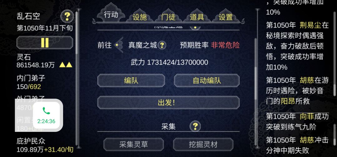打了好几回,忘了回武力了,之前还保存了,关后台在打开就在打真魔之城,重来好几回打不过,都死了,就想办法给他回武力,左边那个暂停,然后点开掌门那个名字,点那个武力值旁边那个用回春丹回武力,再点左边那个继续游戏,武力值恢复就能打了。