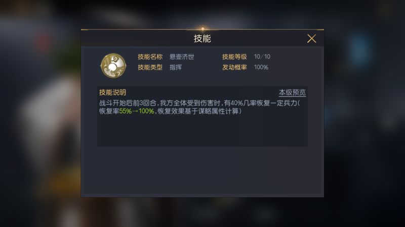 华佗的自带技能为【悬壶济世】,属于指挥型技能,触发概率为100%,在战斗开始的前3回合,我方全体受到伤害时,有40%的几率恢复55%~100%兵力。这个技能的优势在于效果涵盖前3回合,恢复对象为己方全体,覆盖面广,可兼顾兵力高和兵力低的将领(许多技能只针对兵力最低将领进行恢复,或是随机选择对象),这种全面的恢复效果非常适合于开荒时降低兵损,这也是在开荒队伍中强烈推荐将华佗作为辅助的原因。