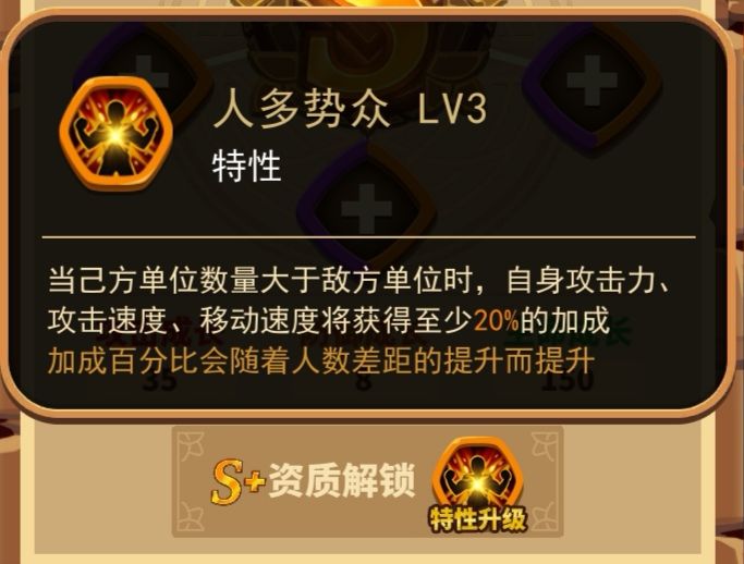 天赋技能:人多势众,只要我方单位数量多于敌方,自身就能获得攻击力、攻速、移速的增幅,人数差越多,增幅越大。(1级天生下限10%,2级S解锁15%,3级S+解锁20%)这个特性配合多人型队伍效果显著,另外打顺风战的时候能减少不少损失。