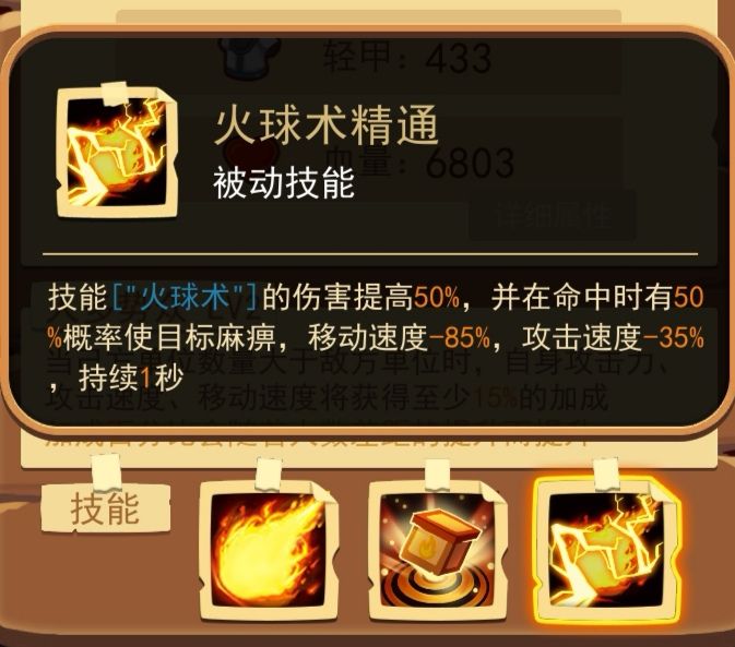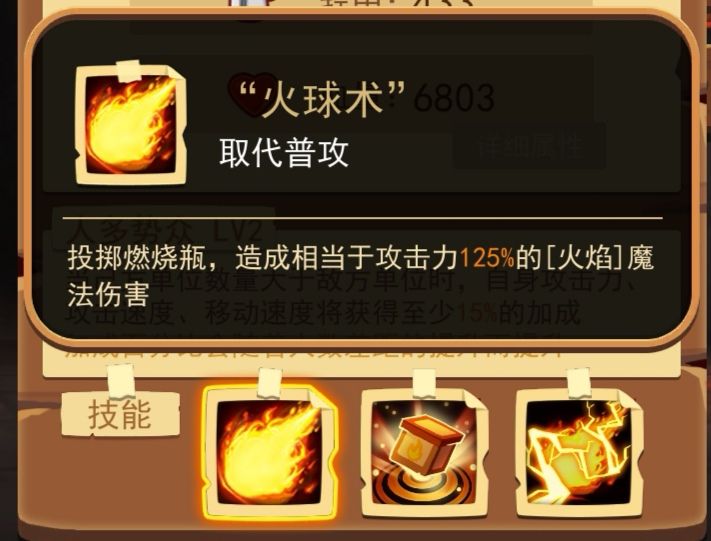 一技能:“火球术”,天生自带,取代普攻,相当于普攻增幅了25%,中规中矩的技能。