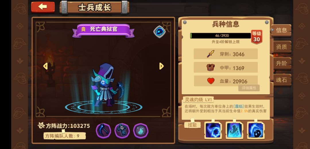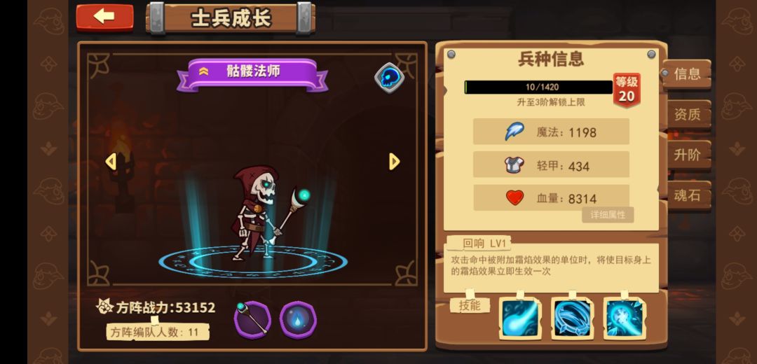 天赋:攻击附带霜炎效果,每秒使敌人掉血(这是亡灵体系的攻击buff,可以跟亡灵其他兵种的技能搭配,升阶提高每秒霜炎伤害)