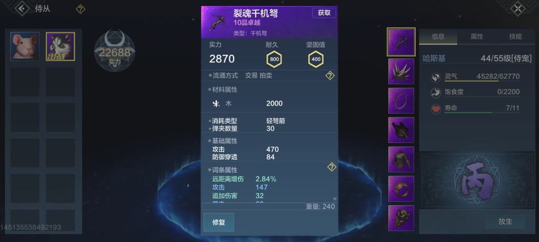 他的战力是很高的,比一些萌新都要高好多甚至比一些玩了很久的人战力还高,我的哈士奇有个技能是戴千机弩加伤害所以给了他一把裂魂千机弩,评分都快赶上我的破晓弩了。