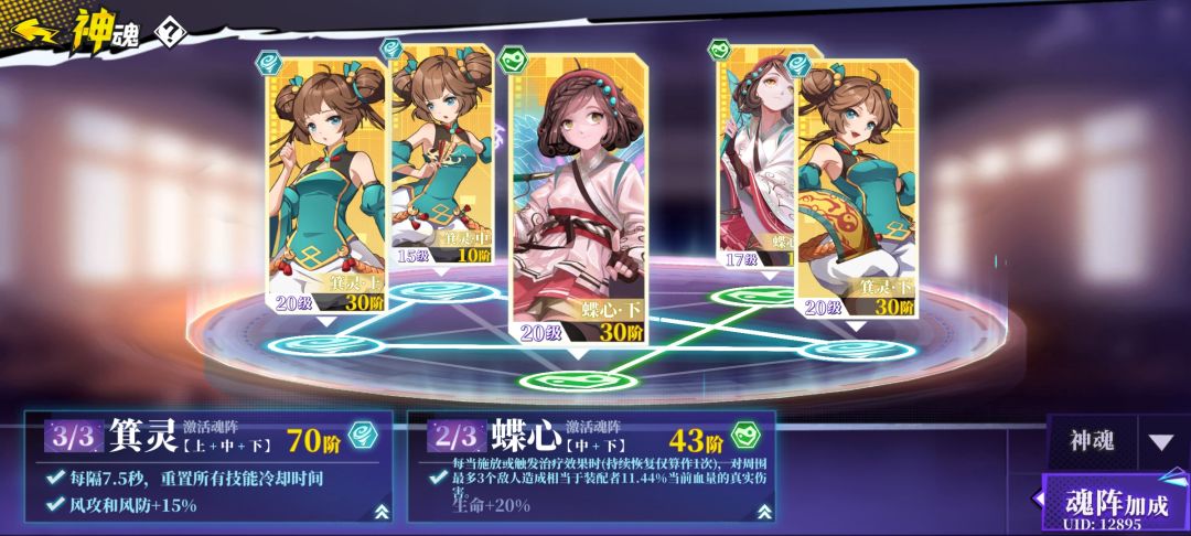 那么,奶妈的主要的神魂选择什么呢?我们不需要追求极致的输出,也不需要追求坚如磐石的硬度,只需要保证自己就算完整吃一套或是被集火也死不掉即可,所以,神魂我选择的是箕灵(ji第一声)三件套,以及蝶心的中和下(上以攻击为主属性,所以不带,中和下以防御和生命为主)