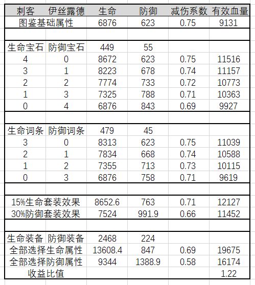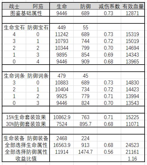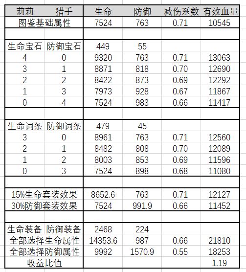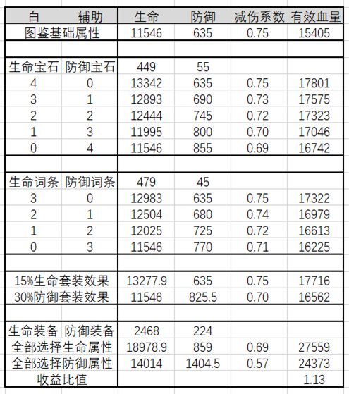 这里选择图鉴的完全体贝爷为样本,全场平均等级视为100级,取舍四颗六级蓝宝石和四颗六级绿宝石,来测算五种搭配情况的有效血量,有效血量更多细节请参见三测介绍时的内容,此处不再重复赘述。